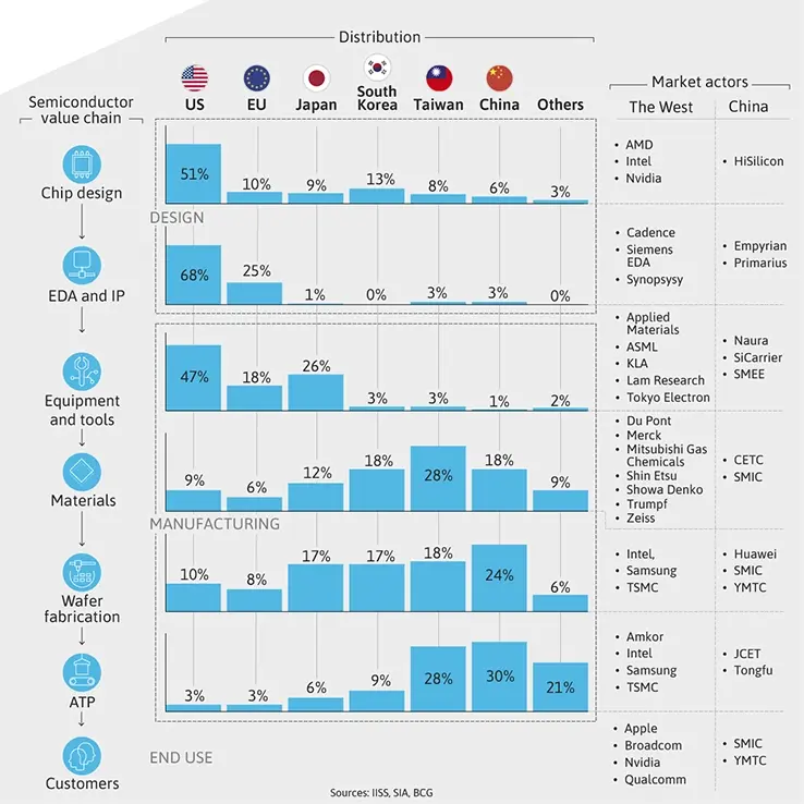 According to a briefing from GSIS (Global Security & Innovation Summit) – citing data from the International Institute for Strategic Studies (IISS), the Semiconductor Industry Association (SIA), and Boston Consulting Group (BCG) – the United States dominates the design and intellectual property layers of the semiconductor value chain, while East Asian economies lead in manufacturing, materials, and packaging.
