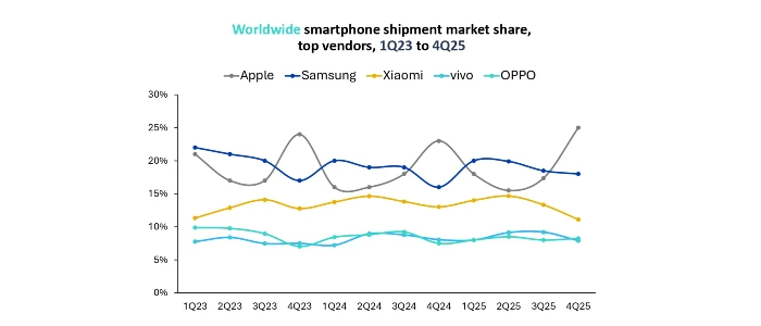 Apple led the global smartphone market in Q4 2025 with a 25% share, delivering what Omdia described as a record fourth quarter. Demand for the iPhone 17 series was the main driver, and Apple also finished 2025 as the world’s largest smartphone vendor for the third consecutive year, marginally ahead of Samsung.